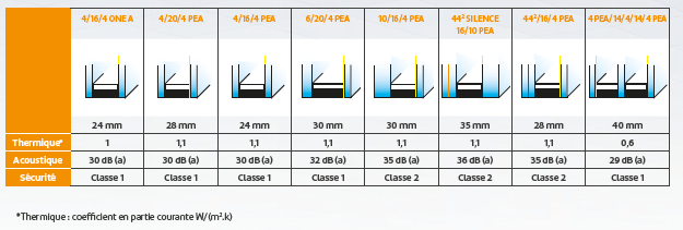 - Différents éléments sont associés pour obtenir le meilleur compromis en terme de qualité et de coûts, comme les profils à chambres multiples, les doubles joints tubulaires à lèvre, le vitrage, les ferrures, etc.