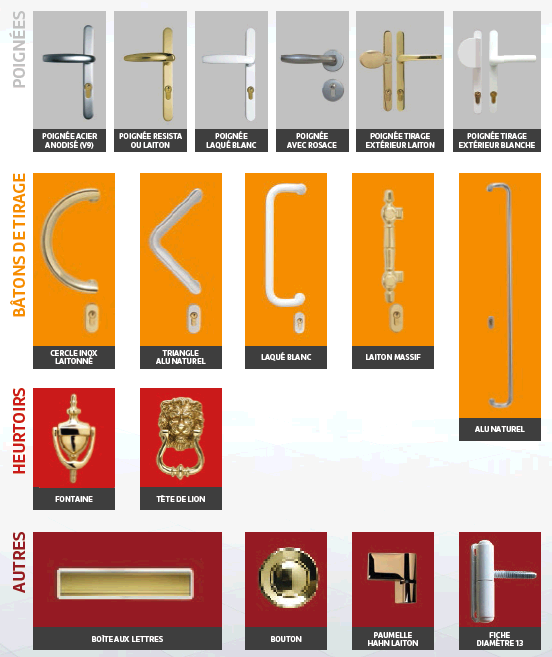 La poignée, bâton de tirage ou bouton, l'heurtoir, ou bien encore la boîte aux lettres sont des accessoires qui apportent la maniabilité, l'élégance, ou l'originalité à votre porte d'entrée.